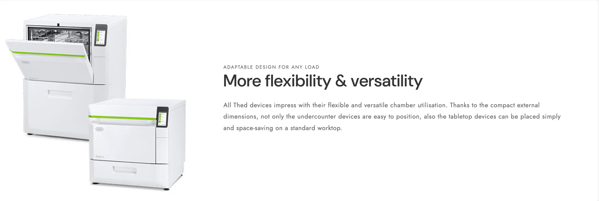 All Thed devices impress with their flexible and versatile chamber utilisation. Thanks to the compact external dimensions, not only the undercounter devices are easy to position, also the tabletop devices can be placed simply and space-saving on a standard worktop.